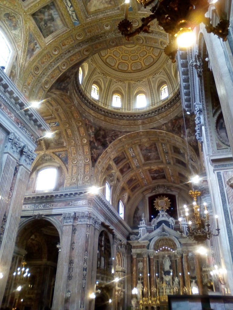 Al centro, poi, una cupola, in corrispondenza del transetto e, ai lati, dieci cappelle, cinque per lato, due delle quali poste accanto all’abside, lungo la parete del presbiterio.